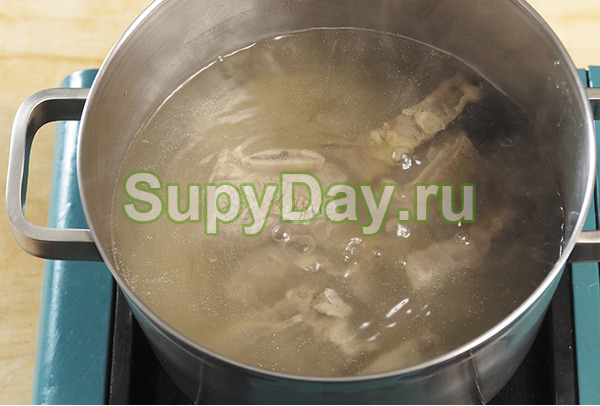 В кипящую воду бросить ребра. Бланшировать в течении 10 минут и достать мясо. Затем заново залить водой и варить уже суп.