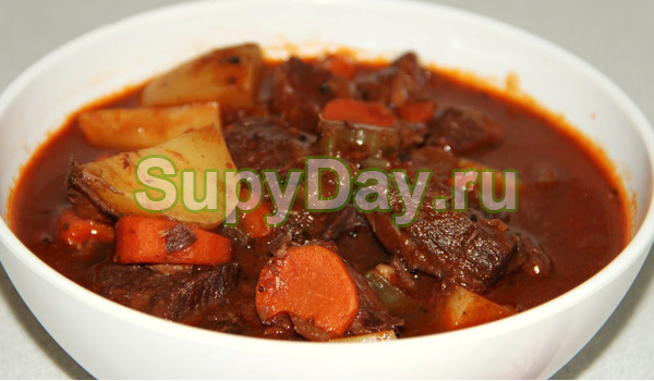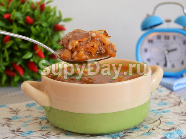Этот рецепт - симбиоз первого и второго блюда. Ингредиенты тушатся и заливаются соусом. Получается очень густой и сытный суп.