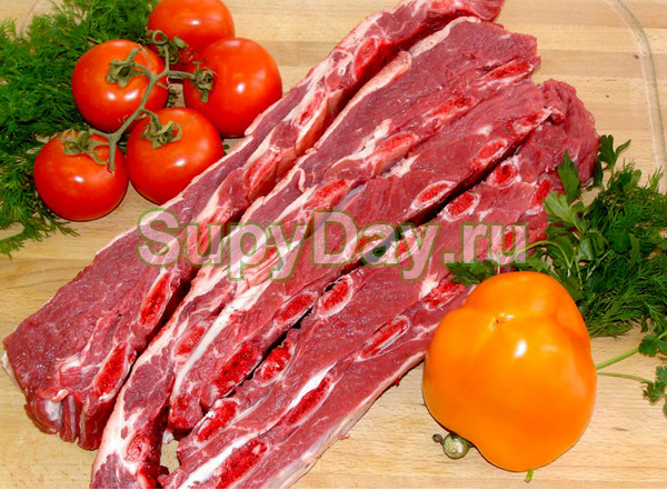 Хоть такое блюдо будет калорийным, но говядина чаще используется в приготовлении диетической еды. Она не настолько жирная, как свинина, поэтому первые блюда с говяжьими ребрами можно кушать людям с проблемами ЖКТ.